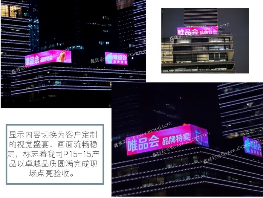 - 客户背景:广州唯品会商业综合体位于沿江地段,是集购物、休闲、娱乐于一体的大型商业项目,需在建筑外立面设置大型户外广告屏,用于品牌宣传与活动推广,要求产品具备高亮度、抗强光、安全稳定、不影响建筑外观与采光等特点,同时需支持裸眼 3D 显示效果。